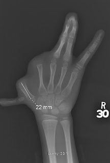 | This is the xray. Notice the lack of the thumb. The thumb metacarpal measures 22mm- good enough to support a fixator. |
