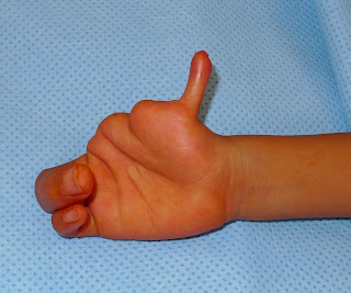 | This is an unusual form of cleft hand (central deficiency). There is no thumb except the floppy “nubbin.” |