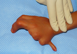 | Another picture of unusual cleft hand with absent thumb |