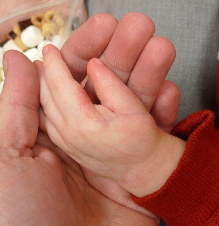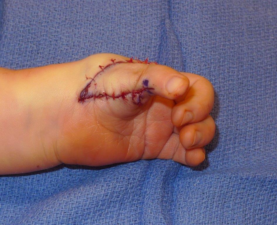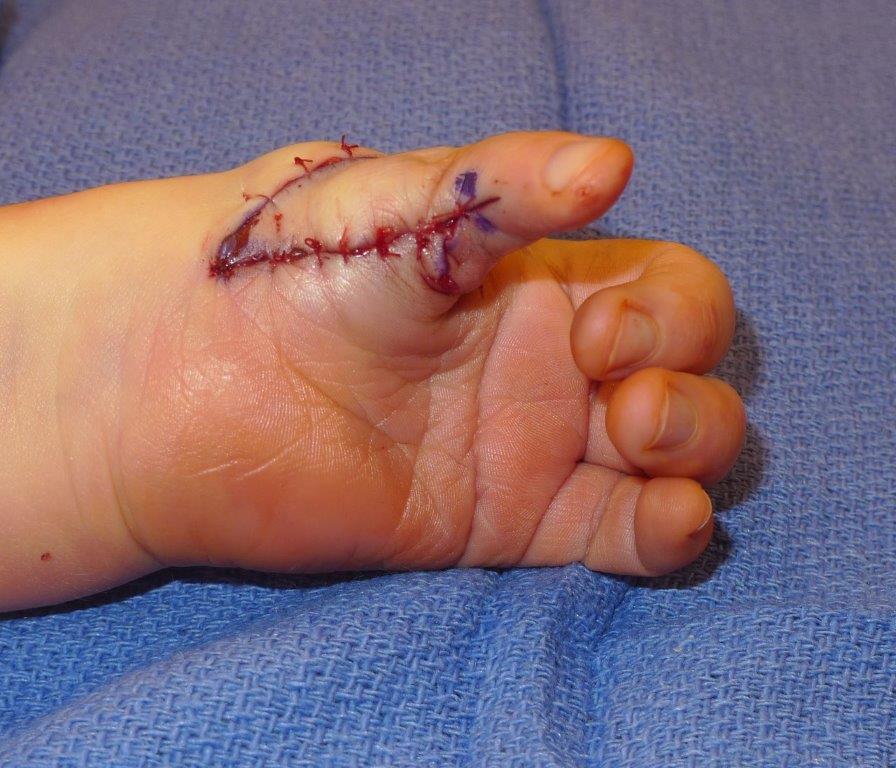 | After pollicization surgery. Note that there still is deformity in the thumb as this will correct over time and with growth. |