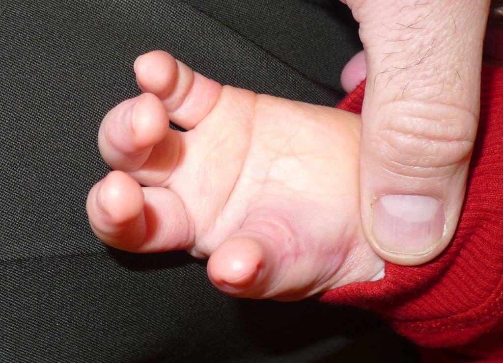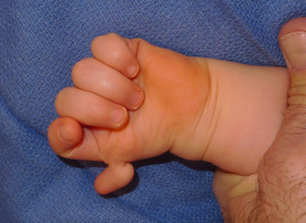 | Hypoplastic thumb– note how small and deficient it is. Also see the deformity of the index finger. |